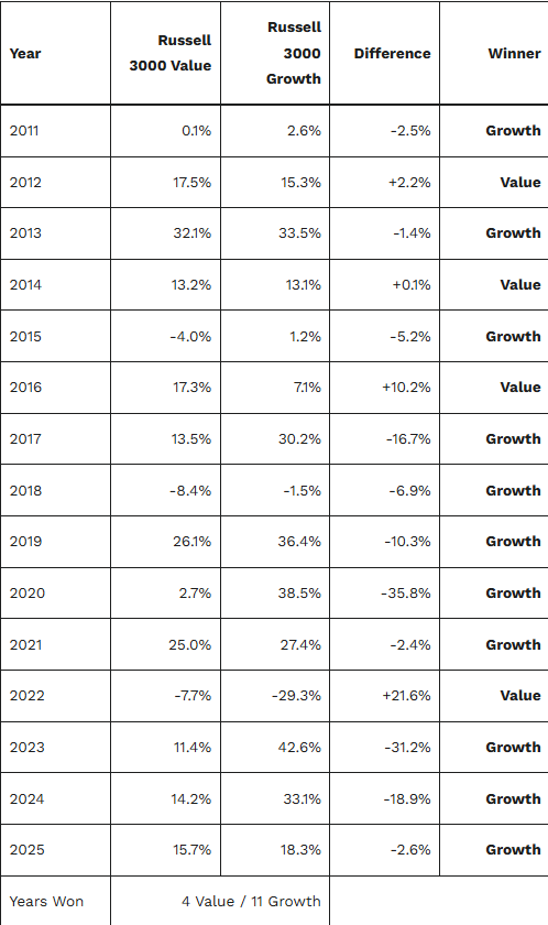 Growth dominated for most of the period (2011-2020, 2023-2024), winning 10 out of 15 years