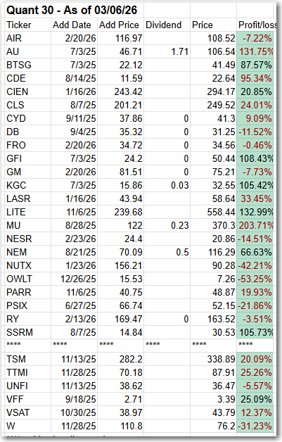 The Quant 30 and Quant Weekly Model Portfolios dropped slightly this week reflecting the overall market drop. The Middle East war continues to bring uncertainty to the market direction.