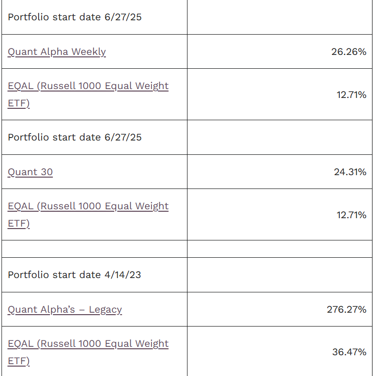 The Quant Alpha Weekly Portfolio remains ahead of its benchmark. Up over 26% since it began on June 27, 2025.