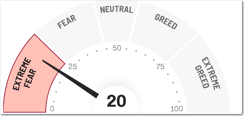 The CNN Fear and Greed Index ends the week at Extreme Fear 20. After four weeks in the Fear rank the Index has dropped to the lowest rank.