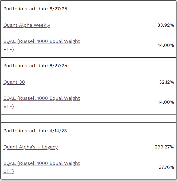 The Quant Alpha Weekly Portfolio remains ahead of its benchmark. Up over 33% since it began on June 27, 2025.