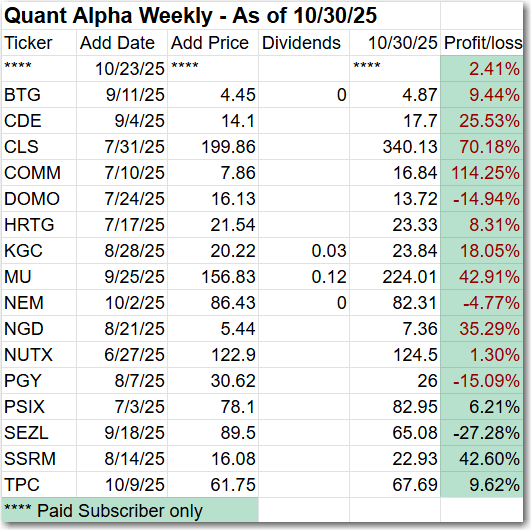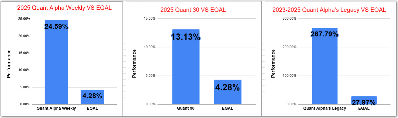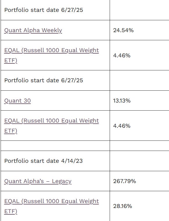 The Quant Alpha Weekly Portfolio continues it’s steady increase in new members and remains substantially ahead of its benchmark. Up over 24% since it began on June 27. 2025.