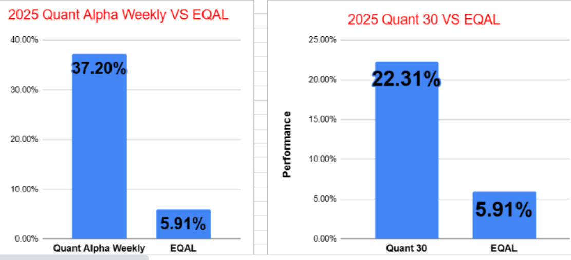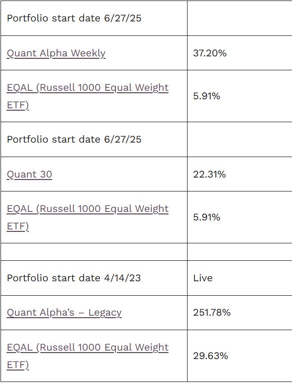 The Quant Alpha Weekly Portfolio continues it’s steady increase in new members and remains substantially ahead of its benchmark. Up over 35% since it began on June 27. 2025.