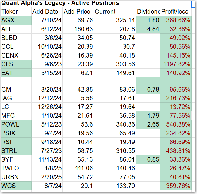 The portfolio now has around 19 stocks in it. It is up over +250% since it began in 2023. Celestica achieves a 11 bagger performance. FOA received a hard Sell this week from the Quant system so it is being Removed from the Portfolio.
