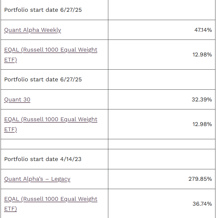 The Quant Alpha Weekly Portfolio remains ahead of its benchmark. Up over 47% since it began on June 27, 2025.