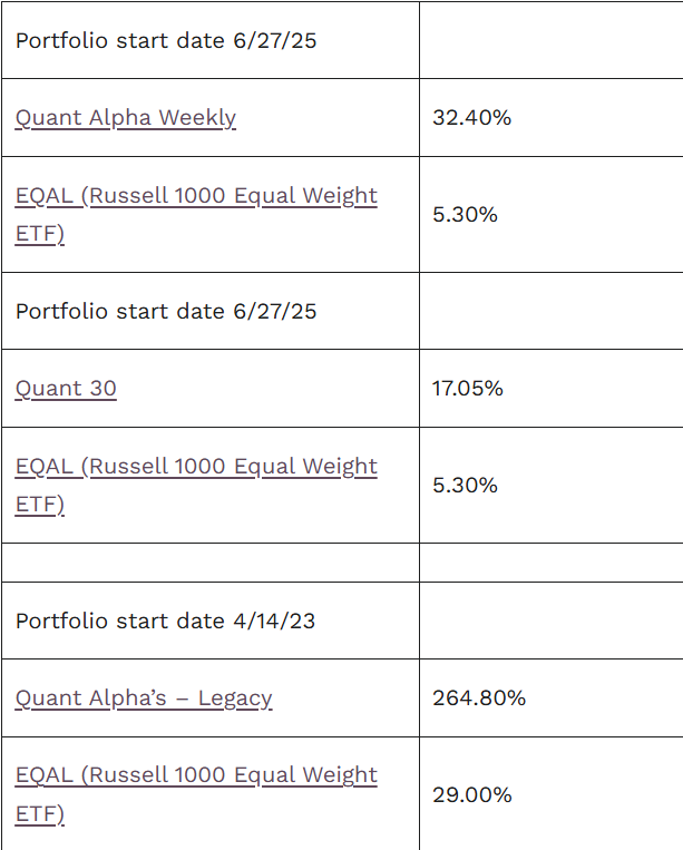 The Quant Alpha Weekly Portfolio remains substantially ahead of its benchmark. Up over 32% since it began on June 27, 2025.
