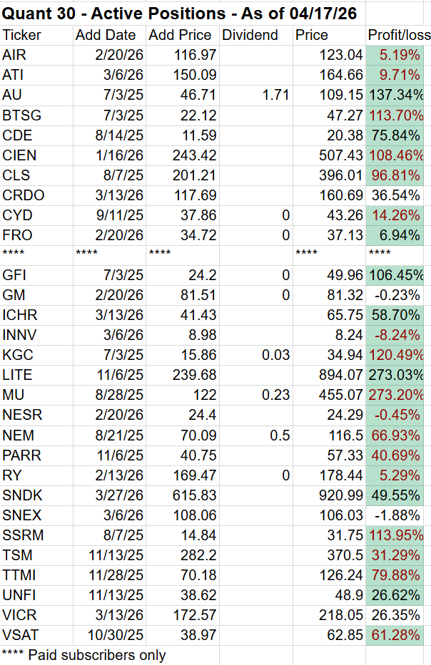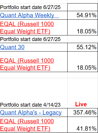 Update 4/27/26 - The Quant 30, Quant Weekly and Quant Legacy Model Portfolios all made new highs again. The Quant 30 went from up 25% at the end of March to up 55% now.