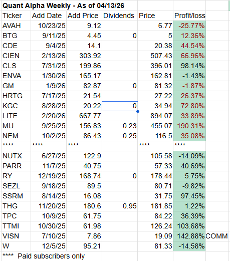 Note: You are enjoying the free subscriber newsletter. Paid subscribers enjoy instant access to weekly Model Portfolio updates upon release and a Top Quant Stocks list. Free subscribers get access to Portfolio updates after a three-week delay but no Top Quant Stocks list. Want timely access to the new Adds/Removes and Top Quant Stocks list?