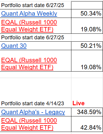 Update 4/20/26 - The Quant 30 and Quant Weekly Model Portfolios had a great week with all three Portfolios making all time highs! The Quant Weekly and Quant 30 are now up 50% from the 6/27/26 start