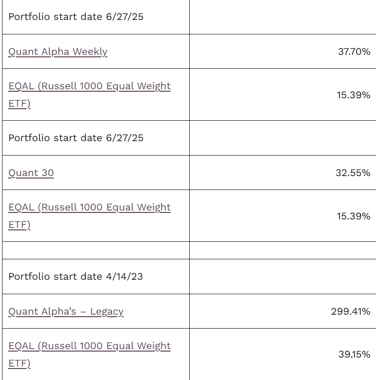 The Quant Alpha Weekly Portfolio remains ahead of its benchmark. Up over 37% since it began on June 27, 2025.