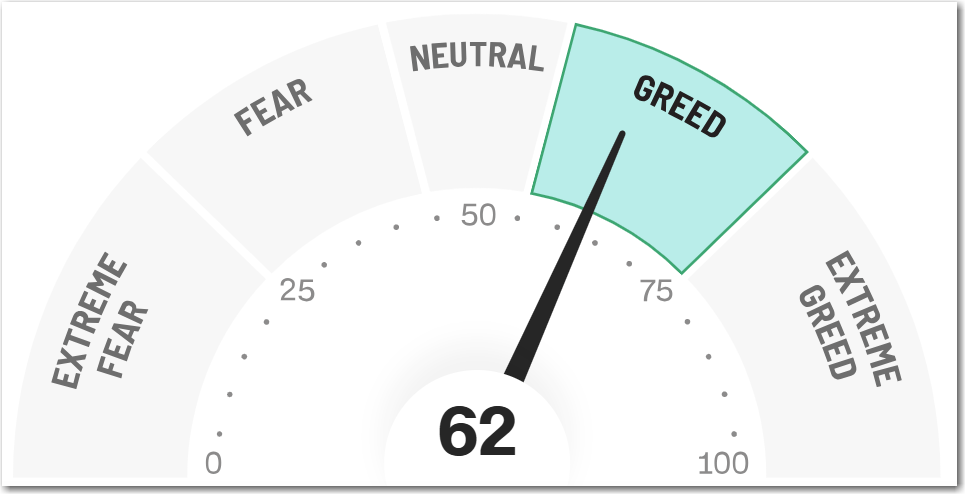 The CNN Fear & Greed Index remained in the Greed zone (around ~62/100) during this period, indicating bullish sentiment among investors despite the week’s mild pullback.